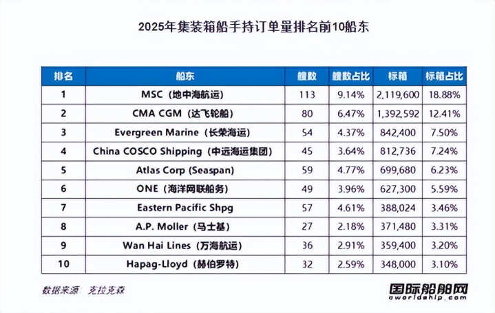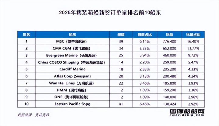 在2025年集装箱船新签订单排名前10的船东中,有3家独立集装箱船运营商——Cardiff Marine(18艘20.52万TEU)、 Seaspan(20艘20.05万TEU)、Eastern Pacific Shipping(41艘13.84万TEU),分别排在第五、第六、第十位。